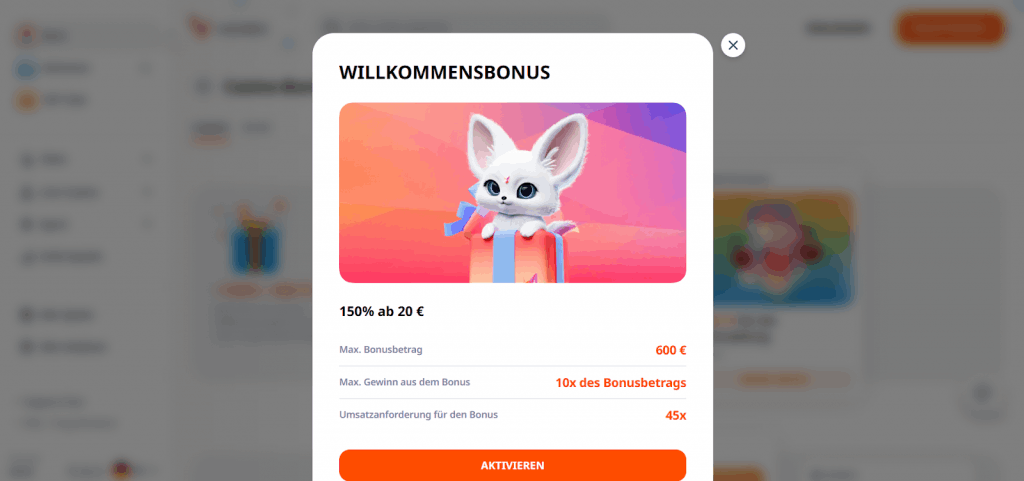 Der Willkommensbonus war tatsächlich das Erste, was ich ausprobiert habe. Ich hab 20 € eingezahlt, bin in den Promo-Bereich, hab auf „Bonus aktivieren“ geklickt – und keine zehn Sekunden später war das Bonusgeld da.