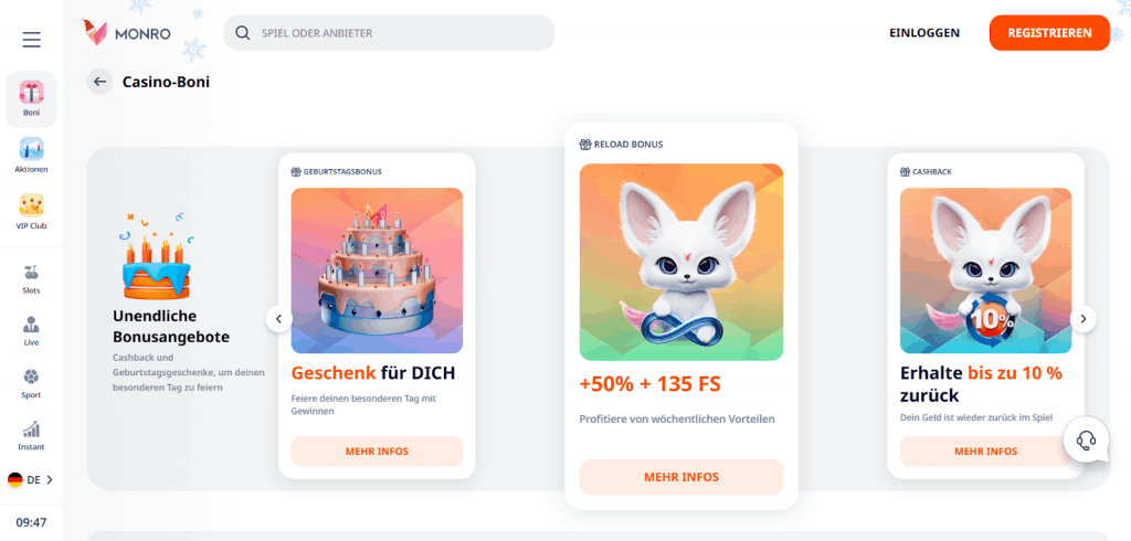Was mir beim Bonusprogramm von Monro sofort gefallen hat: Es wirkt nicht überladen. Klar, es gibt einiges – ein gestaffeltes Willkommensangebot, diverse Reload-Boni, Freispiele jede Woche, gelegentlich Cashback und einen Extra-Bonus zum Geburtstag. Aber alles ist nachvollziehbar aufgebaut. Im Promo-Bereich sieht man auf einen Blick, was gerade läuft und was für einen selbst relevant sein könnte.