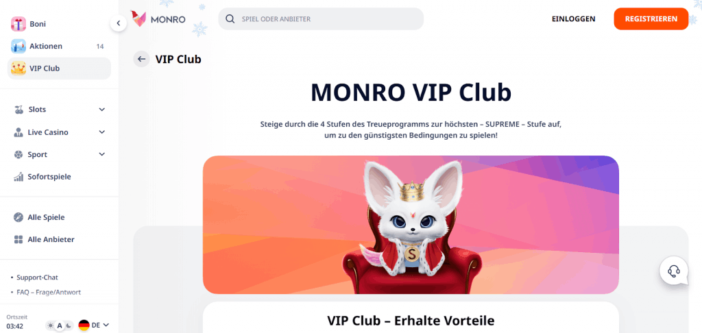 Besonders das wöchentliche Cashback war für mich lohnend, da es bei Monro Casino automatisch jeden Donnerstag gutgeschrieben wird und die Umsatzanforderungen je nach VIP-Level sehr fair sind (3x-10x).
