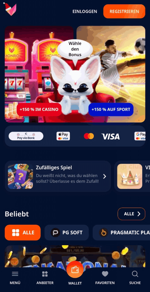 | Spielangebot | Slots, Live-Casino, Tischspiele, Sportwetten, Sofortspiele, Crash-Games |